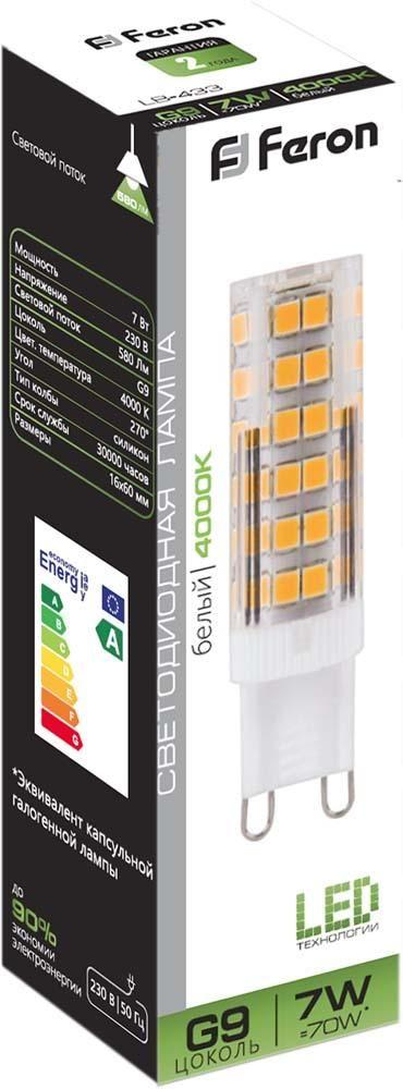 Лампа светодиодная FERON LB-433, JCD9 (капсульная), 7W 175-265V G9 4000К (белый), рассеиватель прозрачный 580Lm, угол рассеивания 270°, 60*16мм