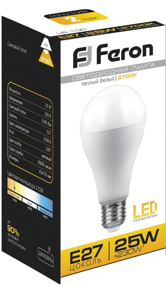 Лампа светодиодная FERON LB-100, A65 (шар), 25W 230V E27 2700К (белый теплый), рассеиватель матовый белый, 2100Lm, угол рассеивания 220°, 135*65мм