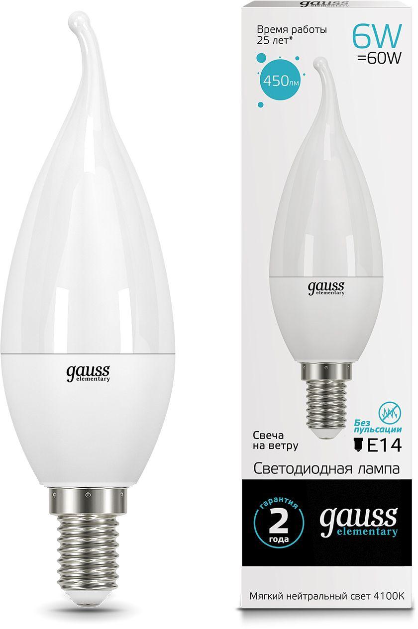 Лампа светодиодная Gauss Elementary 6Вт цок.:E14 свеча 220B св.свеч.бел.нейт. (упак.:10шт) (34126)