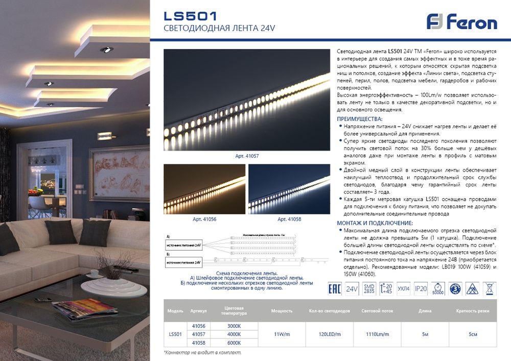 Лента светодиодная 24V FERON LS501, 120*SMD2835, 11W / m, IP20, 6000К (холодный белый), Кратность резки мм 50мм, 5000*8*1.22мм