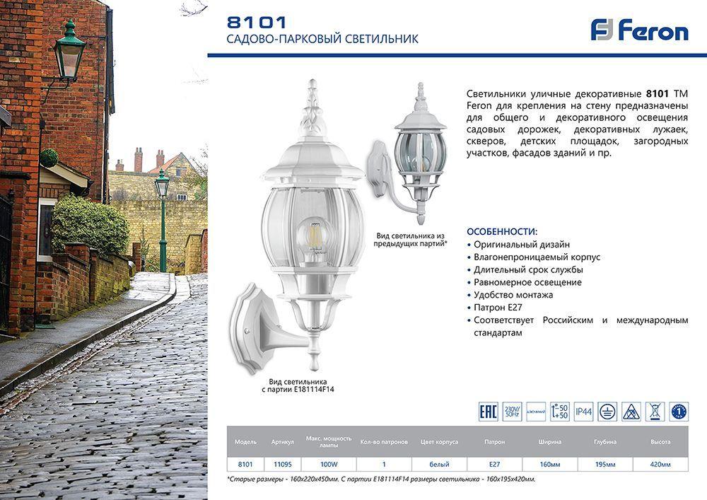 Светильник садово-парковый, серии «Классика», (НБУ) FERON 8101 / PL8101 100W, E27, 230V, IP44, цвет белый, 8-и гранник, на стену вверх, 160*220*450мм