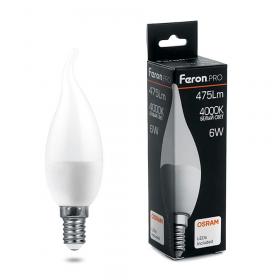 Лампа светодиодная FERON LB-1306, C37T (свеча на ветру), 6W 175-265V E14 4000К (белый), рассеиватель матовый белый, 475Lm, угол рассеивания 200°, 124*37мм