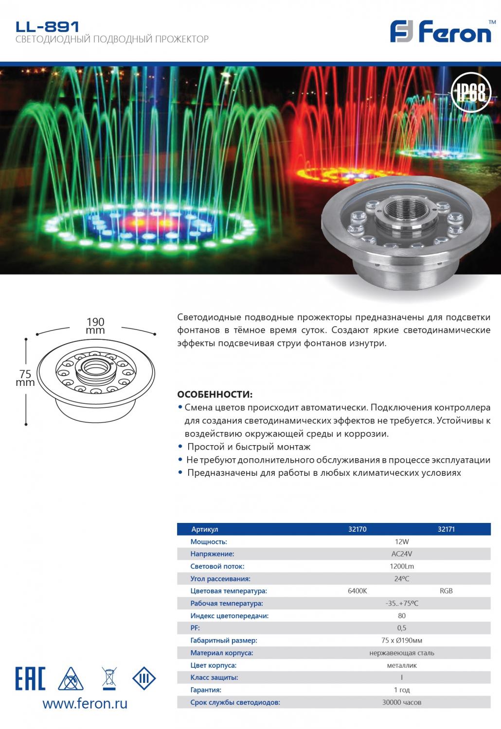 Подводный светильник LL-891, светодиодный, 12 LED, размер 75*190мм, длина провода 0,25м, материал корпуса сталь, цвет сечения RGB, напряжение AC24В, мощность 12Вт, класс защиты от поражения током - 3, степень пылевлагозащиты IP68, срок службы 30000 часов.