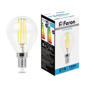 Лампа светодиодная филамент FERON LB-515, G45 (шар малый), 15W 230V E14 6400К (дневной), рассеиватель прозрачный 1340Lm, угол рассеивания 270°, 80*45мм