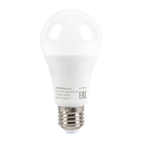 Лампа светодиодная SONNEN EXTRA, 12 (100) Вт, Е27, груша, нейтральный белый, 30000 ч, LED A60-12W-4000-Е27, 457895