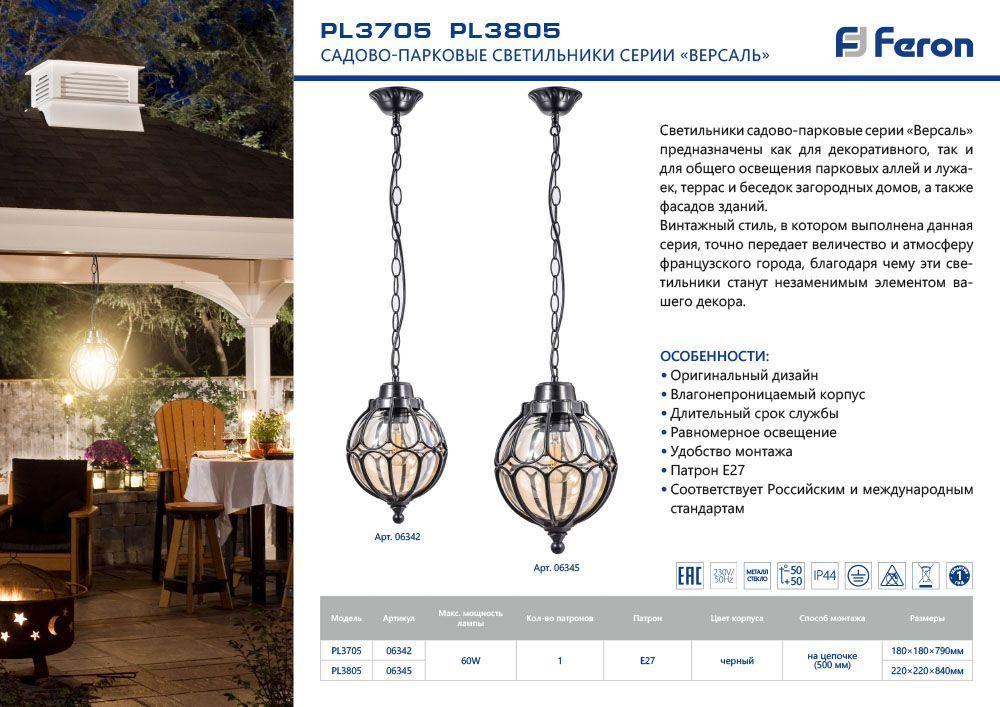 Светильник садово-парковый, серии «Версаль», (НСУ) FERON PL3705 60W, E27, 230V, IP44, цвет черный, шар, на цепочке, 180*180*790мм