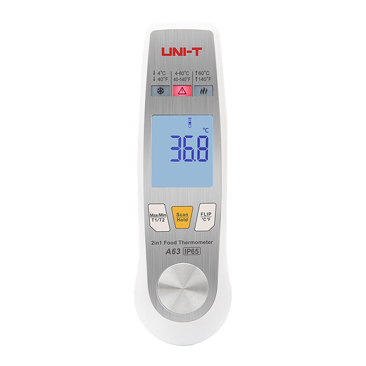 Инфракрасный диапазон измерения: 40С-300С; Диапазон измерения зонда: -50С-300С; измерение температуры 2-в-1; светодиодная сигнализация; проверка HACCP; T1-T2 (разница температур)