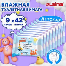 Бумага туалетная влажная детская, смываемая, КОМПЛЕКТ (9 пачек х 42 шт.), БИОРАЗЛАГАЕМАЯ, LAIMA Kids, 116529