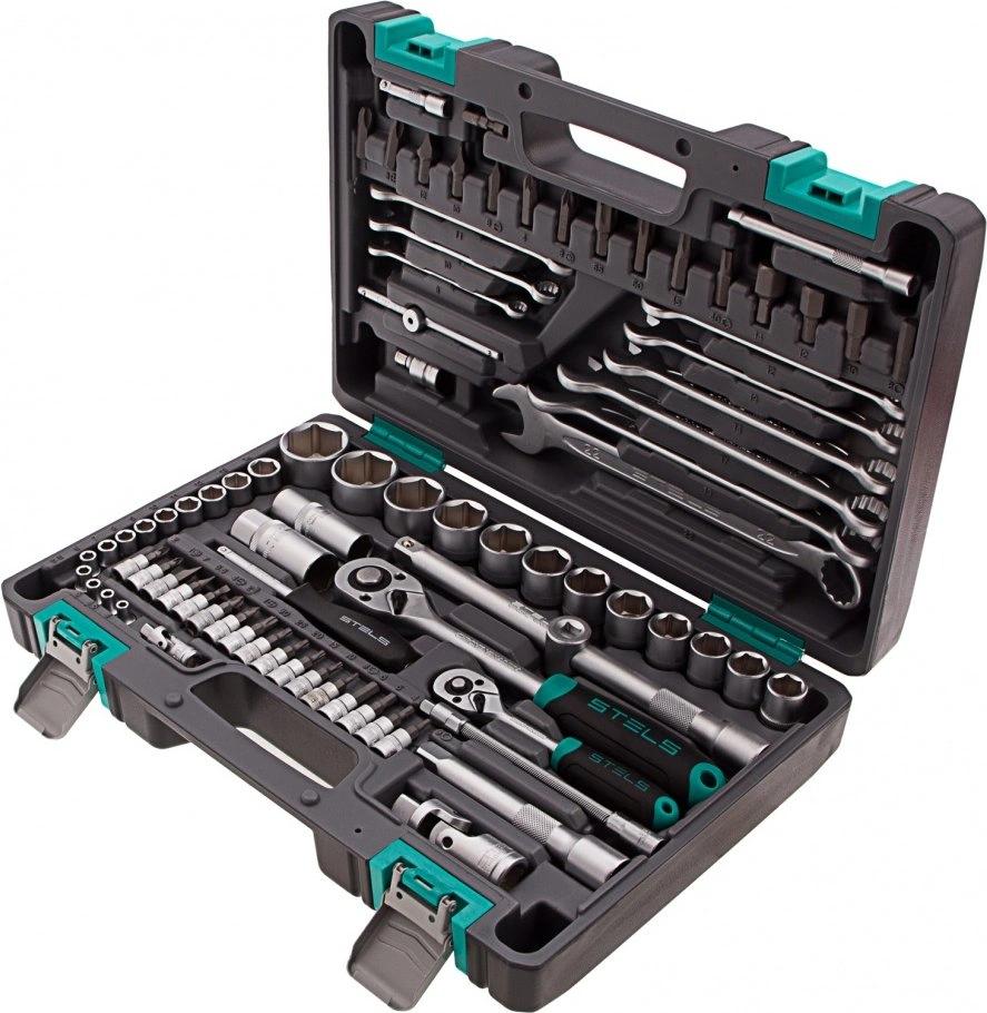Набор инструментов Stels 14105 / 82 предмета / 1 / 2", 1 / 4", CrV / пластиковый кейс / черно-серый (14105)
