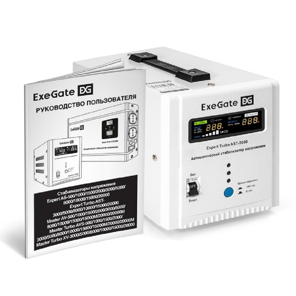 Exegate EX291733RUS Стабилизатор напряжения ExeGate Expert Turbo AST-5000 (5000ВА, вход 80-260В, цветной дисплей, выход 220В±8%, КПД 98%, 5 уровней защиты, метал. корпус, 2*Schuko+ клем.колодка, RTL)