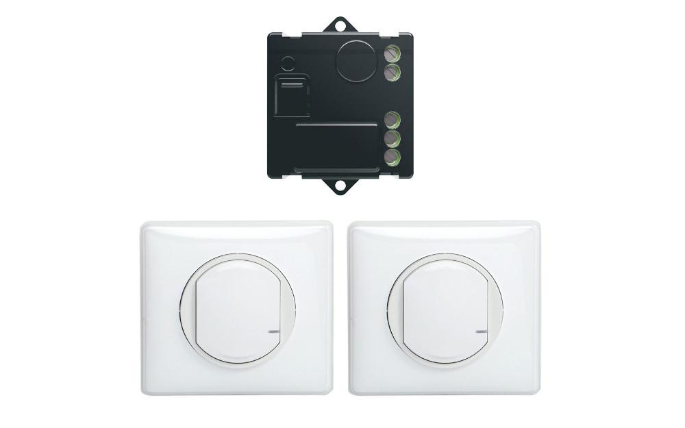 Пакет для управления освещением c 2х мест. [067777] Legrand Celiane with NETATMO - Микромодуль реле 300 Вт 240В + два умных беспроводных 1-клавишных выключателя. - Цвет Белый