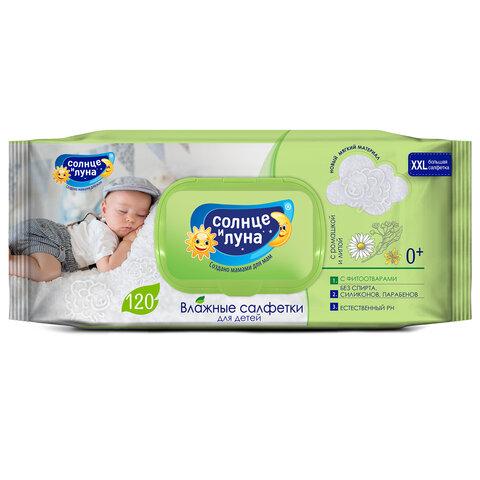 Салфетки влажные детские 120 шт., СОЛНЦЕ И ЛУНА с ромашкой, 0+, с пластиковым клапаном, 9657, 9782