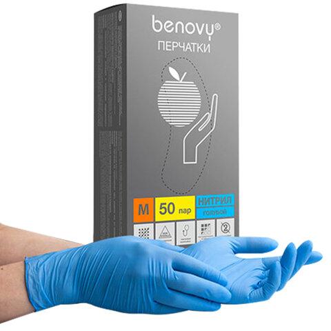 Перчатки нитриловые смотровые 50 пар (100 штук), размер 7-8, M (средний), голубые, BENOVY Nitrile Chlorinated, М