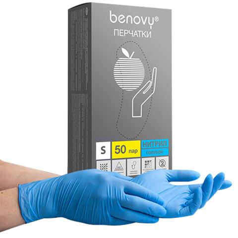 Перчатки нитриловые смотровые 50 пар (100 штук) размер 6-7, S (малый), голубые, BENOVY Nitrile Chlorinated, М