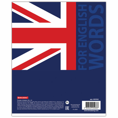 Тетрадь-словарь для записи английских слов А5 48 л., скоба, клетка, BRAUBERG, справка, 403562