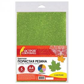 Пористая резина / фоамиран А4, 2 мм, НАБОР, 5 листов, 5 цветов, пастельные цвета, блестки, ОСТРОВ СОКРОВИЩ, 660077