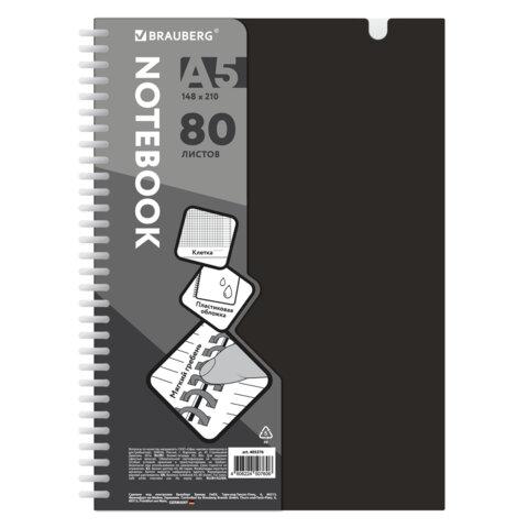 Тетрадь обложка пластик, А5 80 л., гребень мягкий, вырубка для ручки, клетка, BRAUBERG, черный, 405376