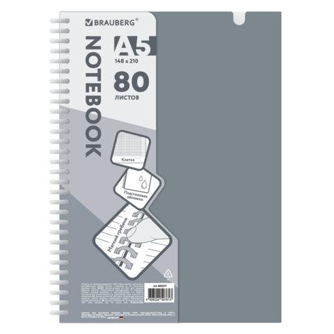 Тетрадь обложка пластик, А5 80 л., гребень мягкий, вырубка для ручки, клетка, BRAUBERG, серый, 405377