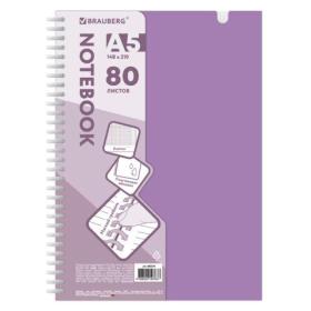 Тетрадь обложка пластик, А5 80 л., гребень мягкий, вырубка для ручки, клетка, BRAUBERG, сиреневый, 405379