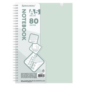 Тетрадь обложка пластик, А5 80 л., гребень мягкий, вырубка для ручки, клетка, BRAUBERG, светло-зеленый, 405378