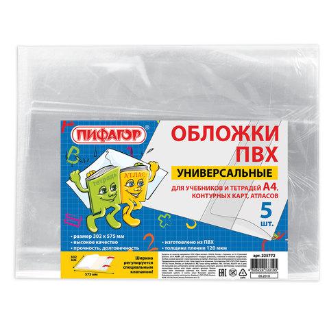 Обложки ПВХ для учебников и тетрадей А4, контурных карт, атласов БОЛЬШОГО ФОРМАТА, КОМПЛЕКТ 5шт, ПЛОТНЫЕ, 120мкм, 302х575мм, ПИФАГОР, 225772