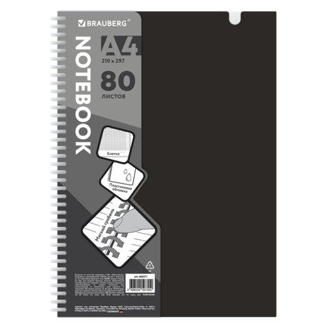 Тетрадь обложка пластик, А4 80 л., гребень мягкий, вырубка для ручки, клетка, BRAUBERG, черный, 405371