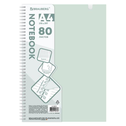 Тетрадь обложка пластик, А4 80 л., гребень мягкий, вырубка для ручки, клетка, BRAUBERG, светло-зеленый, 405373