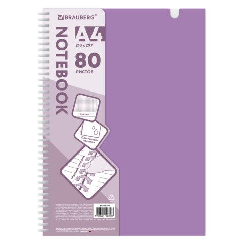 Тетрадь обложка пластик, А4 80 л., гребень мягкий, вырубка для ручки, клетка, BRAUBERG, сиреневый, 405374