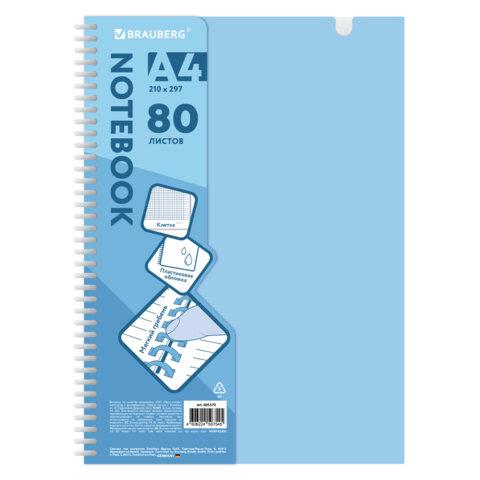 Тетрадь обложка пластик, А4 80 л., гребень мягкий, вырубка для ручки, клетка, BRAUBERG, голубой, 405370