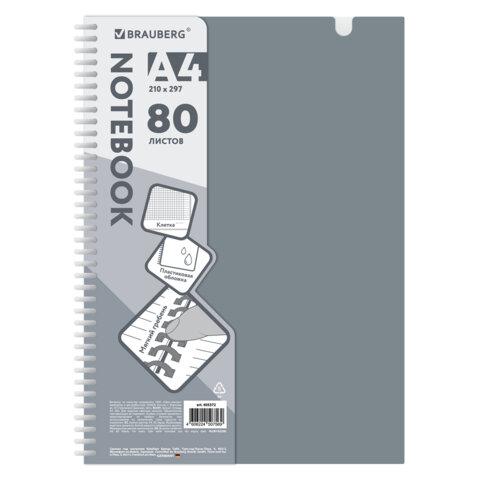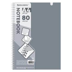 Тетрадь обложка пластик, А4 80 л., гребень мягкий, вырубка для ручки, клетка, BRAUBERG, серый, 405372