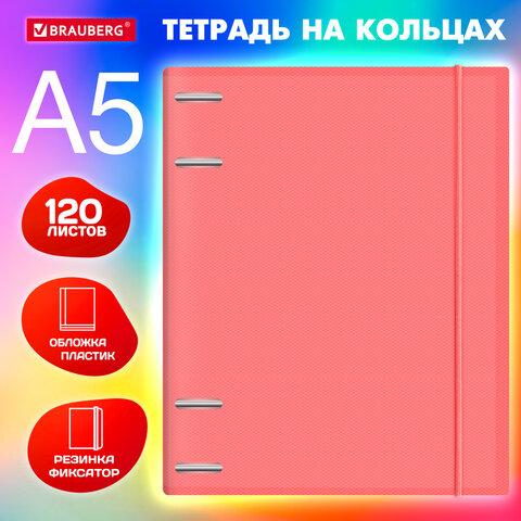 Тетрадь на кольцах А5 175х220 мм, 120 л., пластик, с резинкой, BRAUBERG, Коралловый, 404621