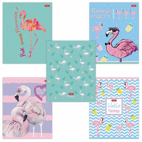Тетрадь 18 л. HATBER скоба, клетка, обложка картон, тиснение, "Фламинго" (5 видов в спайке), 18Т5тВ1