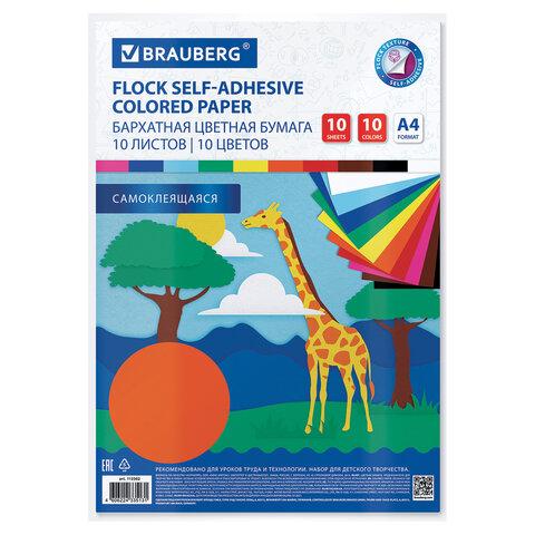 Цветная бумага А4 БАРХАТНАЯ САМОКЛЕЯЩАЯСЯ, 10 листов 10 цветов, 110 г / м2, BRAUBERG, 113502