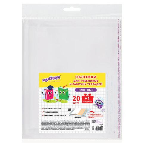 Обложки ПЭ для учебников и рабочих тетрадей, КЛЕЙКИЙ КРАЙ, НАБОР 20 шт. + 1 шт. в ПОДАРОК, 80 мкм, 265х450 мм, ЮНЛАНДИЯ, 274108