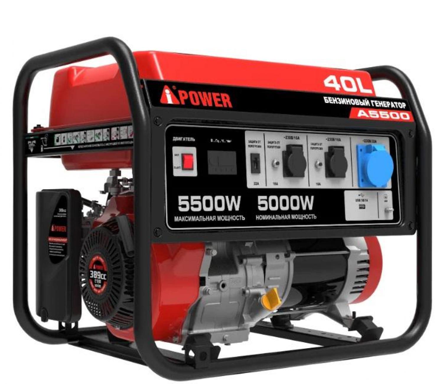 Генератор бензиновый A-iPower A5500 (20105)Бензиновый генератор A-iPower A5500 станет вашим надёжным источником питания при отсутствии электроэнергии. Этот генератор с максимальной мощностью 5500 Вт и номинальной мощностью 5000 Вт работает до 11 часов при 100% нагрузке.A-iPower A5500 оснащён компактным гильзованным 4-тактный OHV-двигателем объёмом 389 куб. см с ручным стартером. На панели управления находятся две стандартные розетки 230В/16А, одна силовая розетка 230В/32А, и разъём USB, от которого можно подзарядить смартфон, планшет и другие гаджеты. На цифровой дисплей в режиме реального времени выводятся сведения о работе генератора.A-iPower A5500 оснащён автоматами защиты, которые при перегрузке предотвратят выход из строя и остановят генератор. Также система защиты предотвратит запуск двигателя при снижении уровня масла.Комплектация- Генератор- Вилка электрическая- Свечной ключ- Воронка- ИнструкцияВнешний вид и/или характеристики товара могут быть изменены производителем в соответствии с производственным процессом.