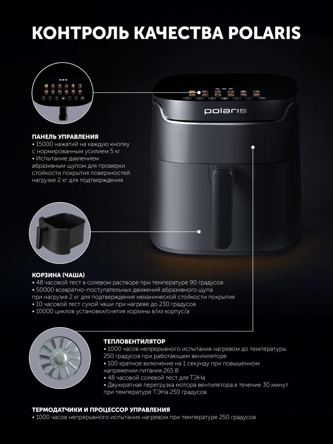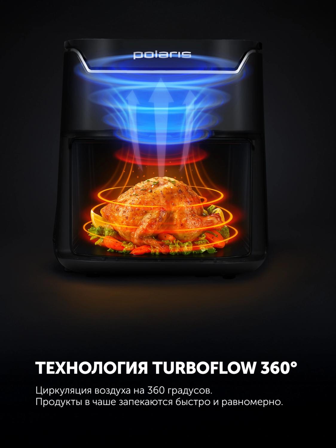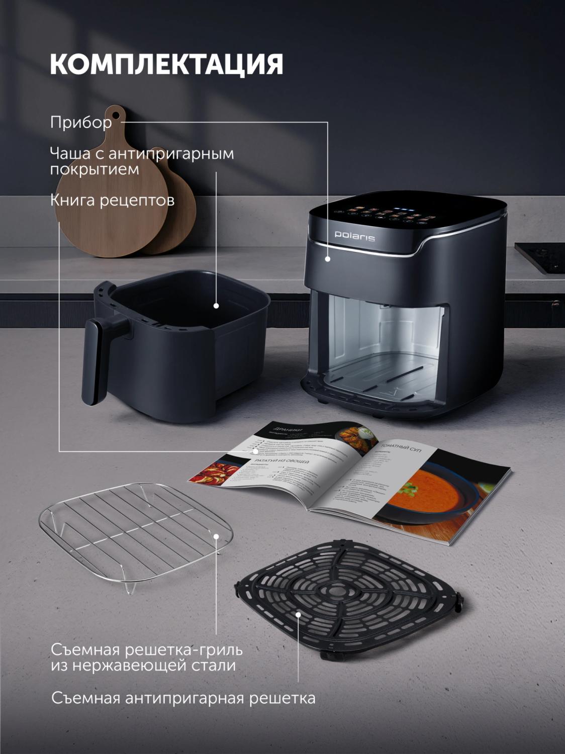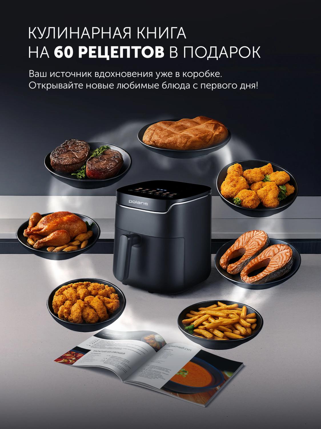 | Список режимов/программ приготовления | картофель фри; курица; куриные крылья; стейк; рыба; овощи; пирог; пицца; сухофрукты; наггетсы; бекон; креветки |