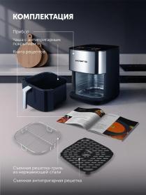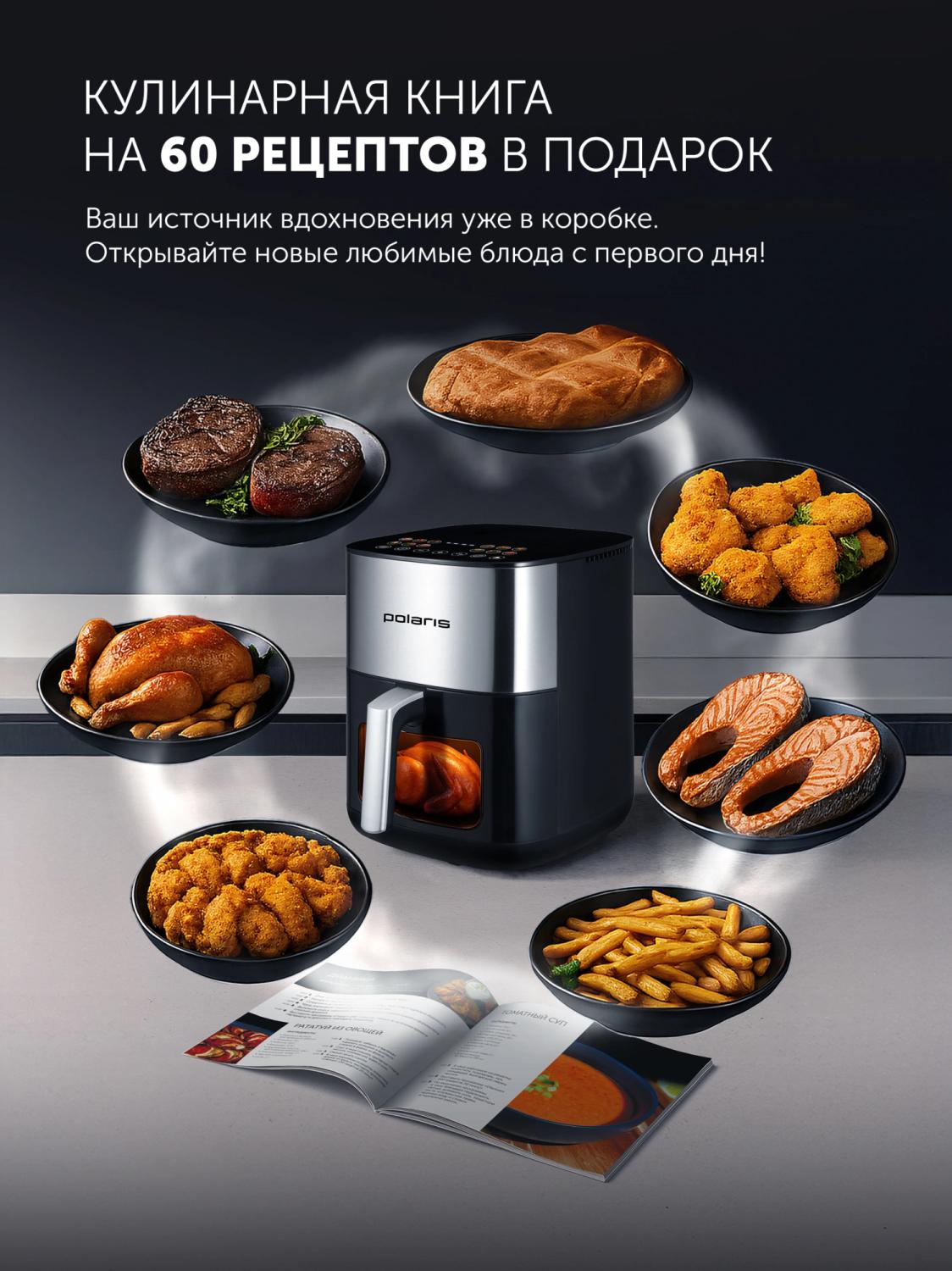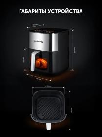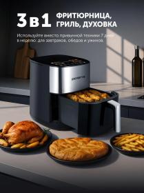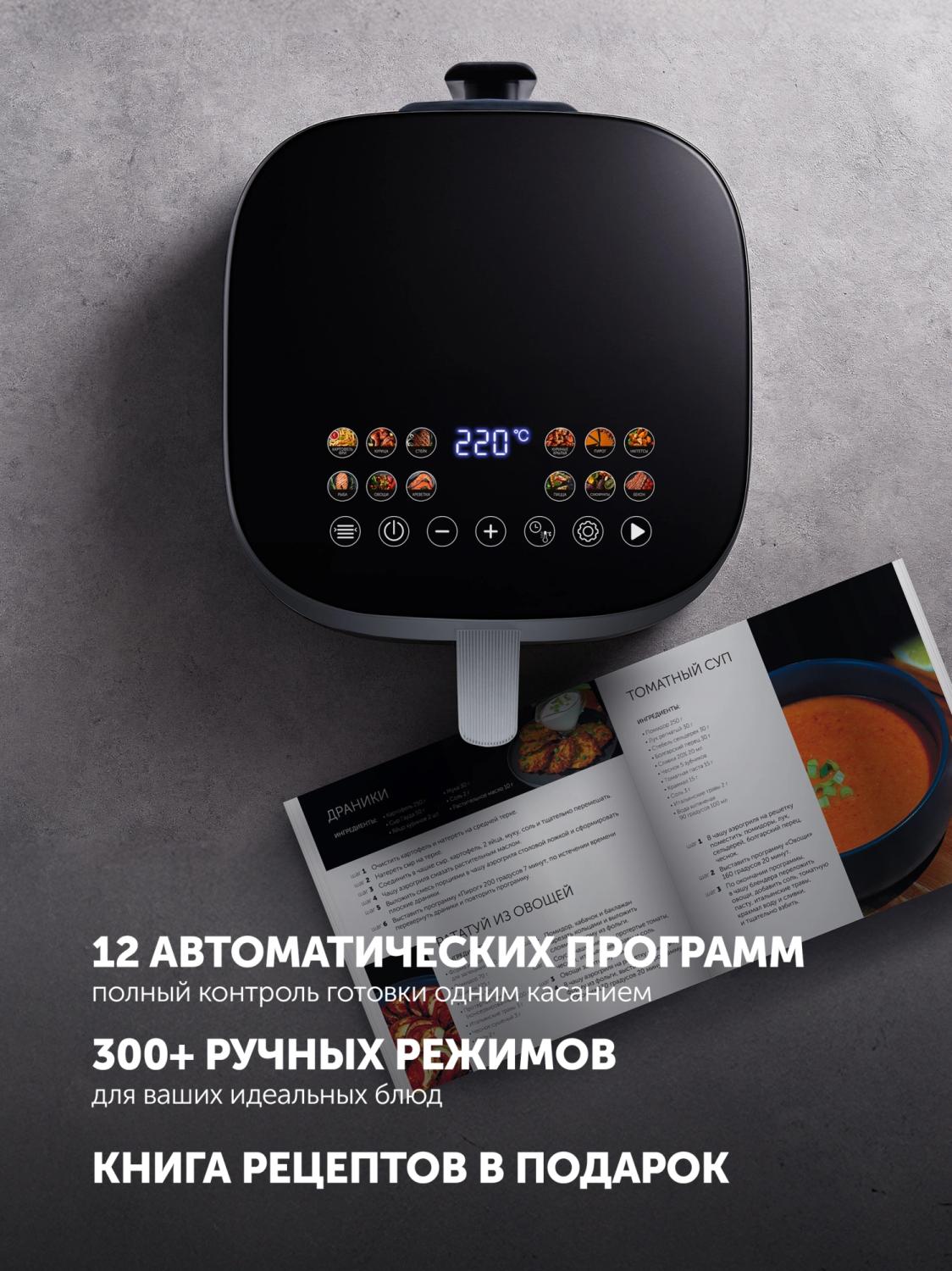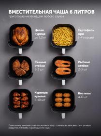 | Список режимов/программ приготовления | картофель фри; курица; стейк; куриные крылья; пирог; наггетсы; рыба; овощи; креветки; пицца; сухофрукты; бекон |