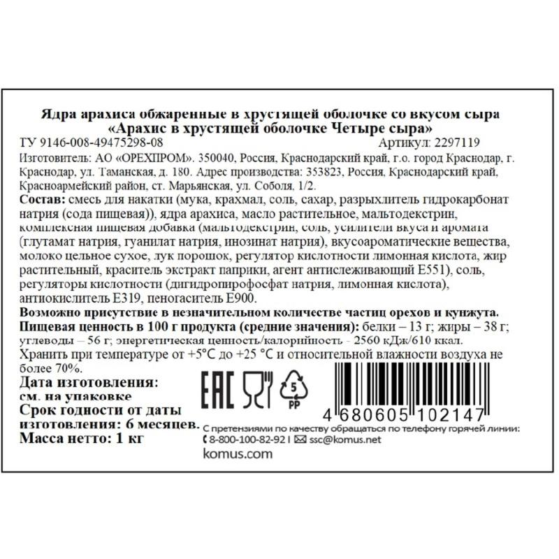 Арахис жареный солёный 4 сыра 1 кг<br><br>Арахис 4 сыра в хрустящей оболочке — это орешек с ароматной хрустящей корочкой со вкусом четыре сыра создан для тех, кто ценит контраст текстур. Вкус нежной хрустящей корочки отлично гармонирует с жареным арахисом. Идеально подойдёт для прогулки или просмотра любимого сериала. <br>Состав: смесь для накатки (мука, крахмал, соль, сахар, разрыхлитель гидрокарбонат натрия (сода пищевая)), ядра арахиса, масло растительное, мальтодекстрин, комплексная пищевая добавка (мальтодекстрин, соль, усилители вкуса и аромата (глутамат натрия, гуанилат натрия, инозинат натрия), вкусоароматические вещества, молоко цельное сухое, лук порошок, регулятор кислотности лимонная кислота, жир растительный, краситель экстракт паприки, агент антислеживающий Е551), соль, регуляторы кислотности (дигидропирофосфат натрия, лимонная кислота), антиокислитель Е319, пеногаситель Е900.<br>Возможно присутствие в незначительном количестве частиц орехов и кунжута.<br>Пищевая ценность: белки — 13 г.; жиры — 38 г.; углеводы — 56 г.<br>Энергетическая ценность: 610 ккал/2560 кДж.<br>Срок годности от даты изготовления: 6 месяцев.<br>Хранить при температуре от +5 до +25 С и относительной влажности воздуха не более 70%.<br><br>Внешний вид и/или характеристики товара могут быть изменены производителем в соответствии с производственным процессом.