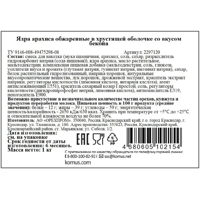 Арахис жареный солёный Бекон 1 кг<br><br>Арахис Бекон в хрустящей оболочке — отборный жареный арахис. Обладает тонкой хрустящей оболочкой из теста с насыщенным вкусом сочного бекона. Отличный вариант для аппетитного и питательного перекуса, сочетается с различными видами напитков. Арахис Бекон в хрустящей оболочке — отличный способ разнообразить свой рацион и получить заряд энергии и бодрости на весь день!<br>Состав: смесь для накатки (мука пшеничная, крахмал, соль, сахар, разрыхлитель гидрокарбонат натрия (сода пищевая)), ядра арахиса, масло растительное, мальтодекстрин, комплексная пищевая добавка (мальтодекстрин, соль, глюкоза, усилители вкуса и аромата (глутамат натрия, гуанилат натрия, инозинат натрия), сахар, белок растительный гидролизованный, паприка порошок, натуральные вкусоароматические вещества, лук порошок, дрожжевой экстракт, краситель экстракт паприки, регуляторы кислотности (лимонная кислота, янтарная кислота), агент антислеживающий Е551), краситель сахарный колер I простой, соль, регуляторы кислотности (дигидропирофосфат натрия, лимонная кислота), антиокислитель Е319, пеногаситель Е900.<br>Возможно присутствие в незначительном количестве частиц орехов, кунжута и продуктов переработки молока.<br>Пищевая ценность: белки — 12 г.; жиры — 39 г.; углеводы — 59 г.<br>Энергетическая ценность: 630 ккал/2650 кДж.<br>Срок годности от даты изготовления: 6 месяцев.<br>Хранить при температуре от +5 до +25 С и относительной влажности воздуха не более 70%.<br><br>Внешний вид и/или характеристики товара могут быть изменены производителем в соответствии с производственным процессом.