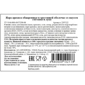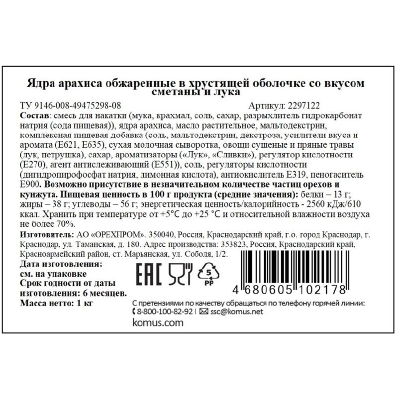 Арахис жареный солёный Сметана и лук 1 кг<br><br>Арахис Сметана лук в хрустящей оболочке — это отборный жареный арахис в хрустящей оболочке с нежно-сливочным вкусом зелёного лука со сметаной. Отличается высокой пищевой ценностью, пользой для организма и отличными вкусовыми качествами. Данный снэк идеальный компаньон для вечеринок, просмотра фильмов или просто для быстрого перекуса.<br>Состав: смесь для накатки (мука, крахмал, соль, сахар, разрыхлитель гидрокарбонат натрия (сода пищевая)), ядра арахиса, масло растительное, мальтодекстрин, комплексная пищевая добавка (соль, мальтодекстрин, декстроза, усилители вкуса и аромата (Е621, Е635), сухая молочная сыворотка, овощи сушёные и пряные травы (лук, петрушка), сахар, ароматизаторы («Лук», «Сливки»), регулятор кислотности (Е270), агент антислеживающий (Е551)), соль, регуляторы кислотности (дигидропирофосфат натрия, лимонная кислота), антиокислитель Е319, пеногаситель Е900.<br>Возможно присутствие в незначительном количестве частиц орехов и кунжута.<br>Пищевая ценность: белки — 13 г.; жиры — 38 г.; углеводы — 56 г.<br>Энергетическая ценность: 610 ккал/2560 кДж.<br>Срок годности от даты изготовления: 6 месяцев.<br>Хранить при температуре от +5 до +25 С и относительной влажности воздуха не более 70%.<br><br>Внешний вид и/или характеристики товара могут быть изменены производителем в соответствии с производственным процессом.