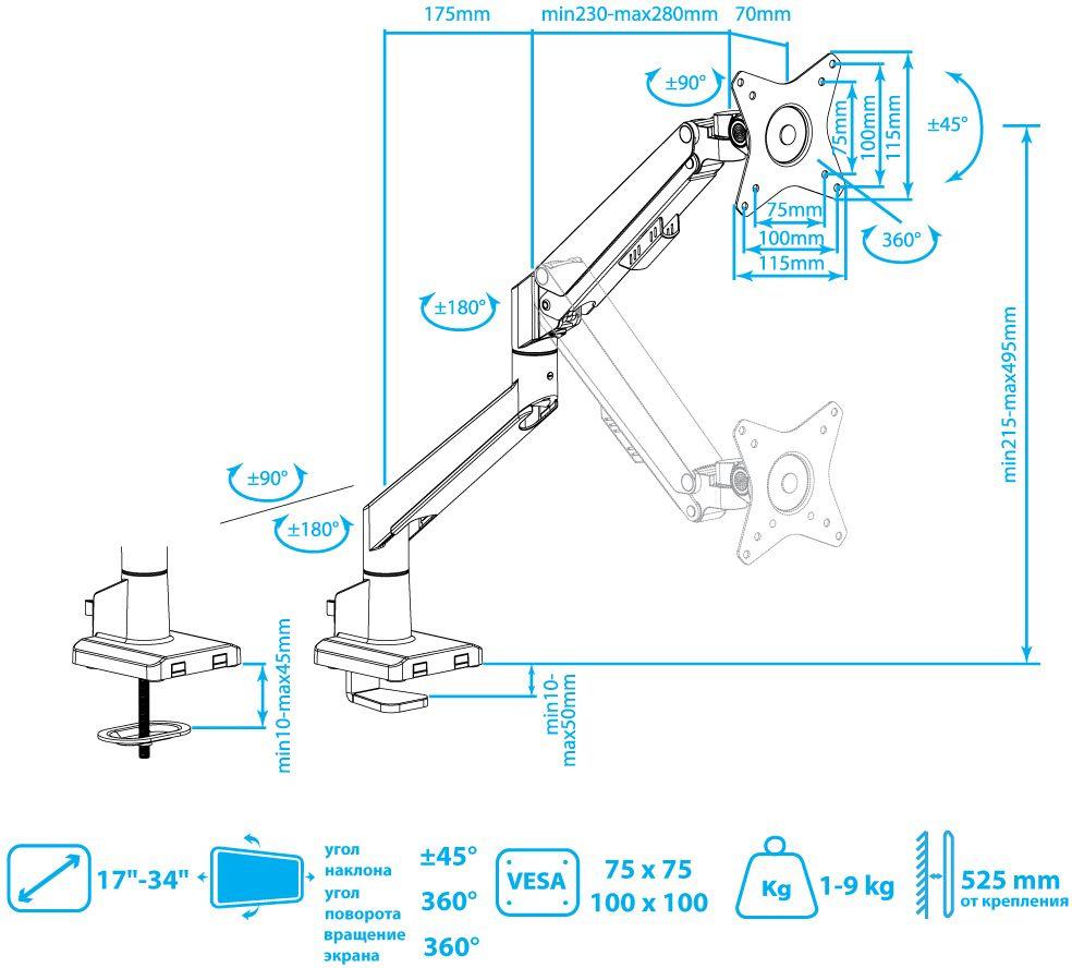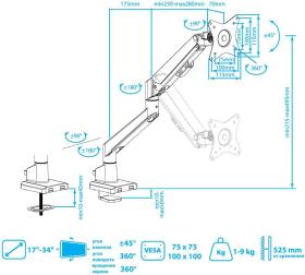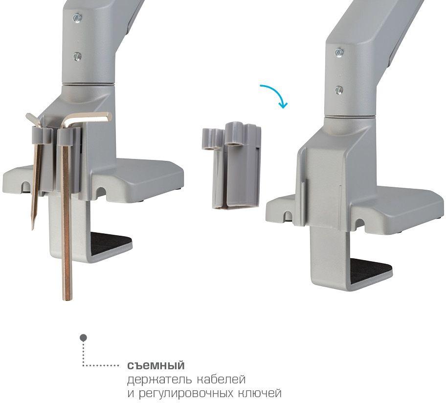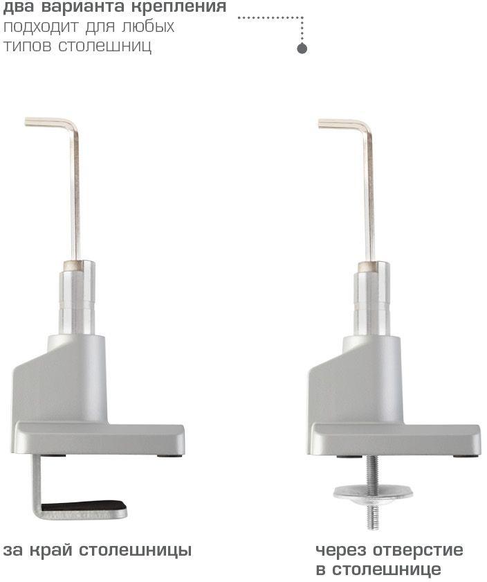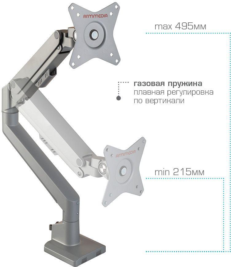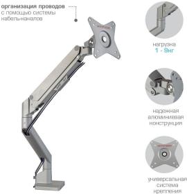 | Особенности | Независимая регулировка каждого экрана - монитор можно поворачивать вокруг своей оси на 360°, наклонять вверх и вниз, придвигать или удалять от себя, Встроенная газовая пружина обеспечивает плавное и лёгкое движение экрана вверх и вниз, фиксацию в любом промежуточном положении. |