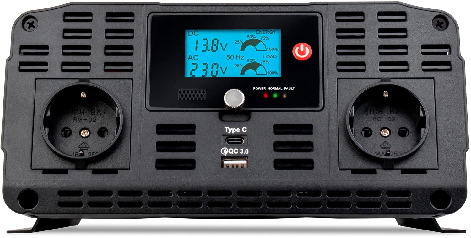 Особенности Чистая синусоида (PSW), порты Type-C и USB с QC, корпус ABS, LCD-экран, активное охлаждение, отслеживание ёмкости аккумулятора, медные контакты с огнестойкой оболочкой, крепления для фиксации инвертора, 6 предохранителей 40A, контакт заземления, звуковое предупреждение, система электрических защит