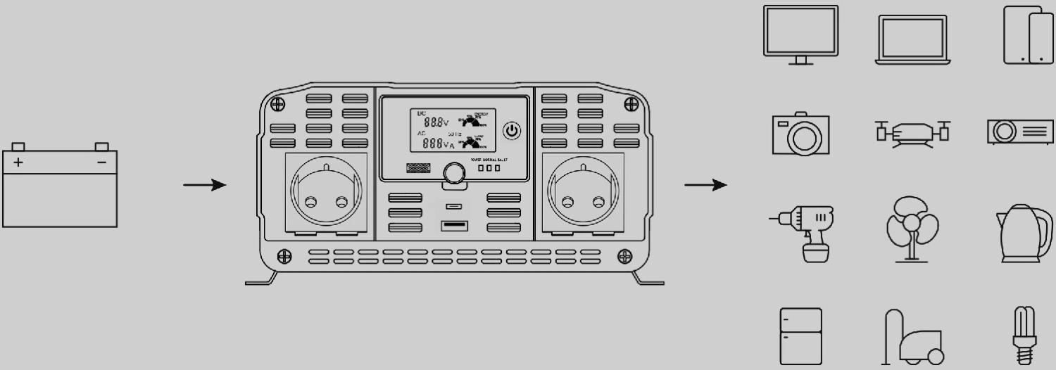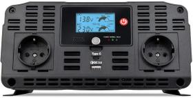 Особенности Чистая синусоида (PSW), порты Type-C и USB с QC, корпус ABS, LCD-экран, активное охлаждение, отслеживание емкости аккумулятора, медные контакты с огнестойкой оболочкой, крепления для фиксации инвертора, 10 предохранителей 40A, контакт заземления, звуковое предупреждение, система электрических защит