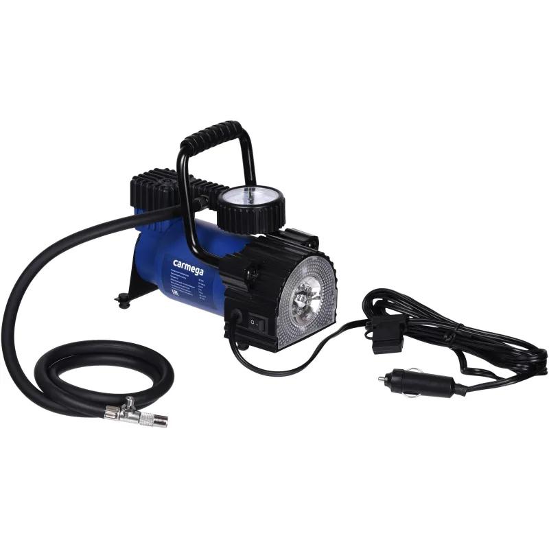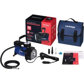 Компрессор автомобильный Carmega 35 л/мин (CARM-AC-35L)Мощный компрессор Carmega AC-35L накачает колёса как легкового авто, так и кроссовера. Оптимально для колёс R14-R17. В комплекте предусмотрен набор переходников для накачивания резиновых изделий (мяч, надувной матрас, лодка).Преимущества- Точный двушкальный манометр.- Металлический корпус защищает от перегрева.- LED-фонарь с отдельной кнопкой включения поможет в тёмное время суток.Комплектация: компрессор поршневой со светодиодным фонарём, кабель питания, набор переходников, сумка для хранения, руководство по эксплуатации.