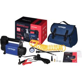 Компрессор автомобильный Carmega 50 л/мин (CARM-AC-50)Мощный компрессор Carmega AC-50 с лёгкостью накачает колёса внедорожника. Оптимально для колёс от R18 и больше.Преимущества- Точный двушкальный манометр.- Металлический корпус защищает от перегрева.- Съёмный витой шланг длиной 4 м (плюс кабель питания 3 м) позволит легко добраться до каждого колеса авто.- Питание от АКБ авто, надёжные изолированные зажимы 'крокодилы'.Комплектация: компрессор поршневой, кабель питания, съёмный витой шланг, набор переходников, сумка для хранения, руководство по эксплуатации.