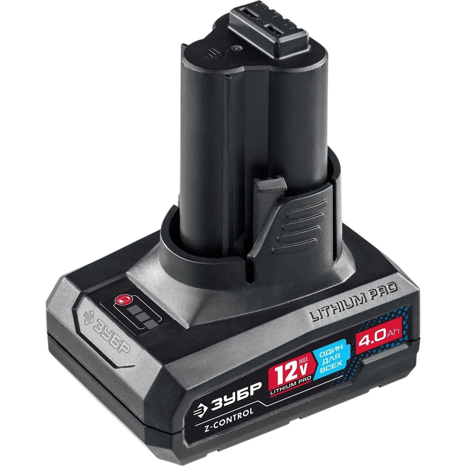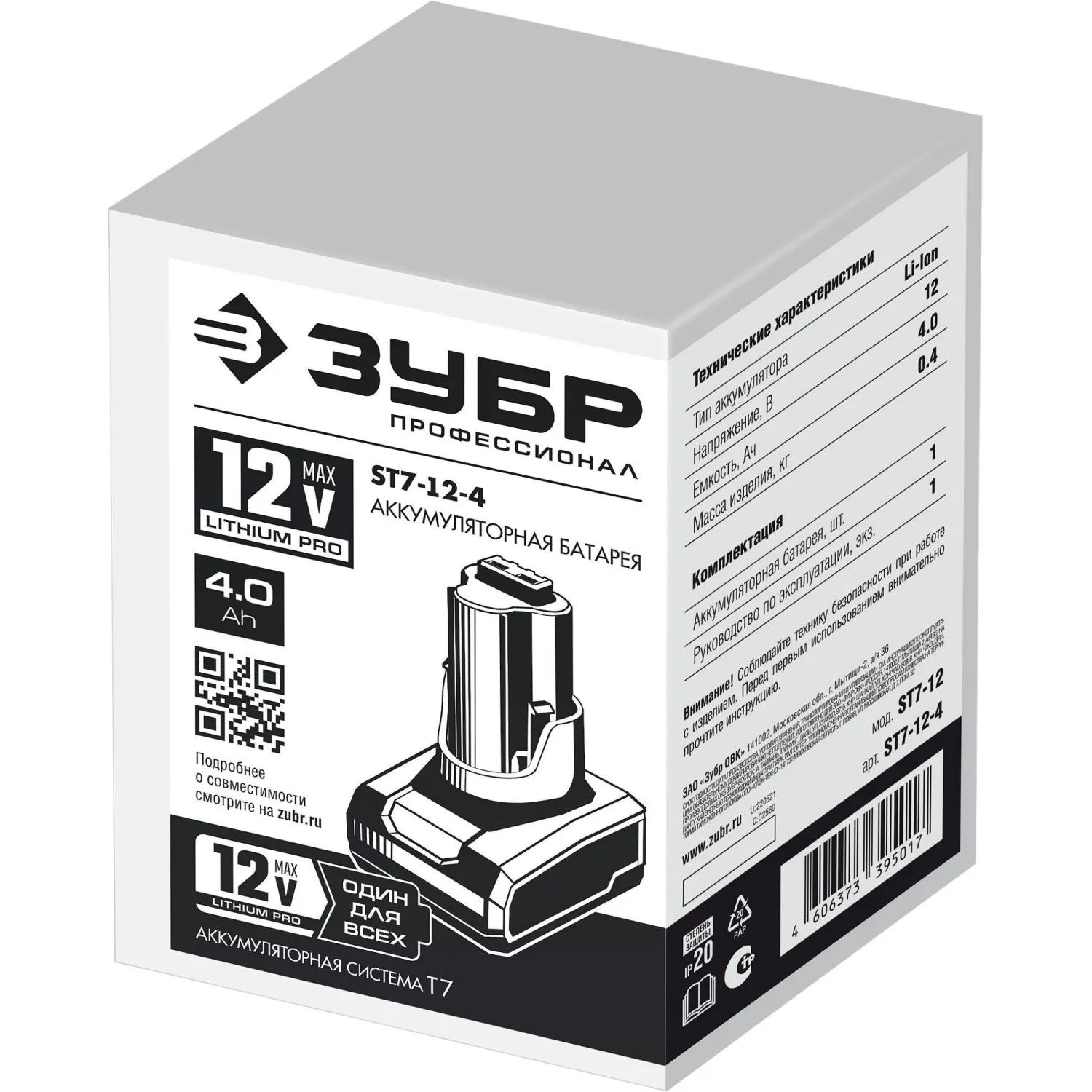 Аккумулятор Зубр Профессионал (12 В, 4 Ач, Li-ion, ST7-12-4)<br><br>Источник питания для шуруповёрта Зубр позволит Вам работать с полной отдачей. Современные Li-Ion элементы профессионального качества гарантируют превосходные технические характеристики, надёжность и результат.<br><br>Применение<br>Для обеспечения питания аккумуляторного инструмента.<br><br>Преимущества<br>• Мощность и производительность в компактном исполнении<br>• Li-Ion Pro батарея для выдающейся эффективности:<br>— увеличение производительности на 50%<br>— отсутствие эффекта памяти<br>— отсутствие потери мощности в процессе работы<br>• Защита от перегрева, глубокой разрядки и перегрузки (осуществляется шуруповёртом)<br>• Более 500 циклов заряда / разряда<br>• Возможность зарядки на БЗУ<br>• Ударопрочный корпус из ABS пластика<br>• Возможна зарядка в любое время<br><br>Внешний вид и/или характеристики товара могут быть изменены производителем в соответствии с производственным процессом.