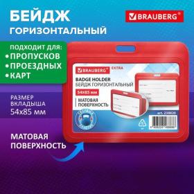 Горизонтальный бейдж BRAUBERG для именной карточки предназначен для идентификации сотрудников в компаниях, а также на семинарах, тренингах, презентациях и других мероприятиях.Бейдж подходит для крепления на ленте, держателе с рулеткой. Изготовлен из жесткого, приятного на ощупь, матового пластика, гарантирующего долгий срок службы и защищающего от влаги и пыли Вашу именную карту. Идеально подойдёт для чувствительных к механическим повреждениям магнитных карт и пропусков. Размер вкладыша 54х85 мм. Обратная сторона вкладыша подготовлена под персонализацию - фото, ФИО, должность и название компании.