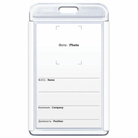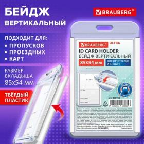 Вертикальный бейдж BRAUBERG ULTRA для хранения пропусков и карточек сотрудников, ID-карт, проездных и банковских карт.Бейдж подходит для крепления на ленте, держателе с рулеткой. Изготовлен из высокопрочного акрила и пластика, гарантирующего его долгий срок службы. Обладает повышенной вместимостью - влезет 2 и более карт. Идеально подойдёт для чувствительных к механическим повреждениям магнитных карт и пропусков. Размер вкладыша – 85х54 мм. Вкладыш оснащен местом под персонализацию - фото, ФИО, наименование компании и должность.