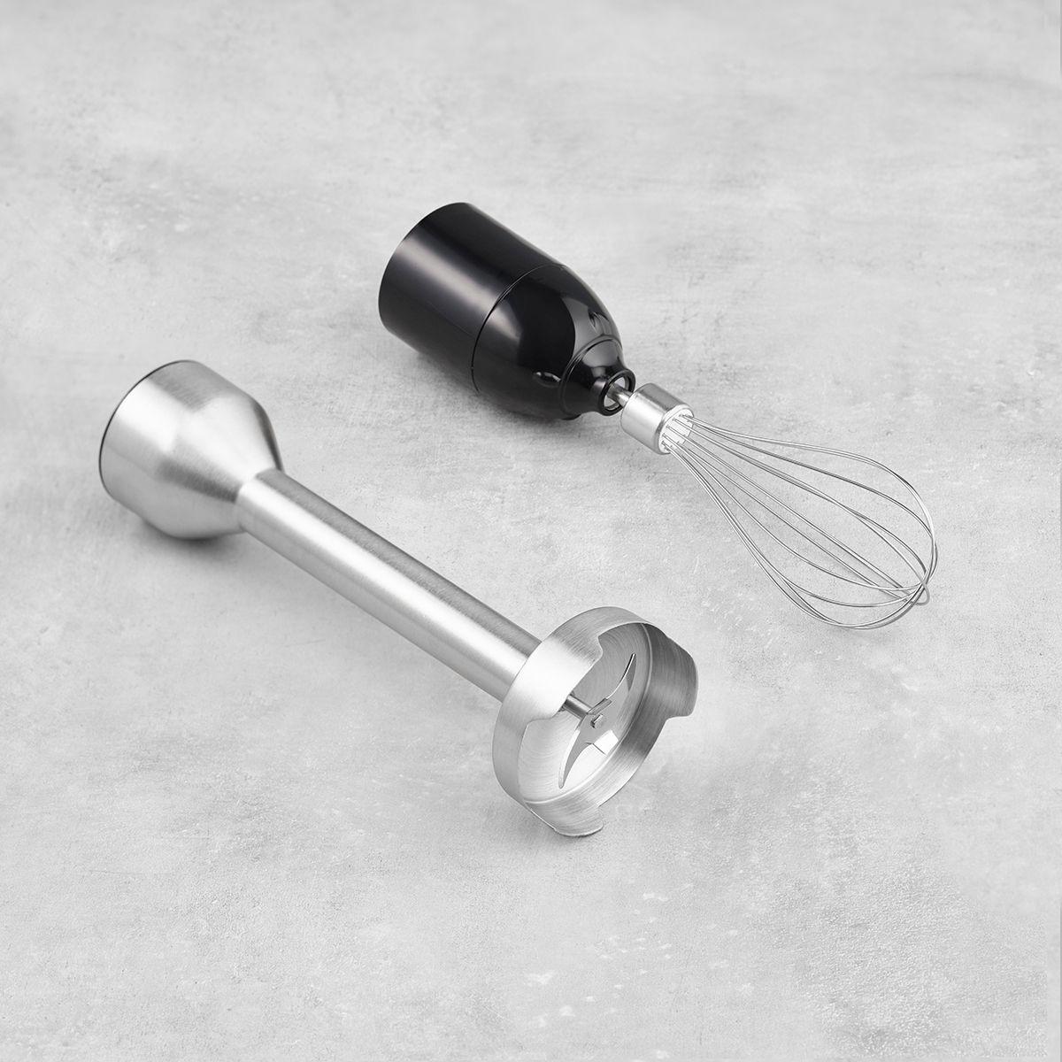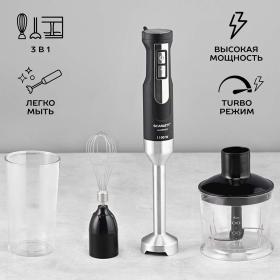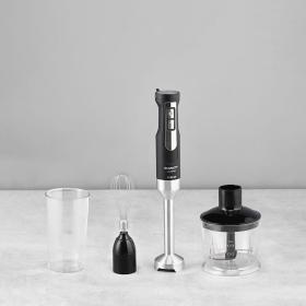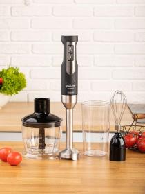 Погружной блендер Scarlett SC-HB42F61 оснащён мощным мотором высокой мощности 1100 Вт, к нему прилагается мини-измельчитель, мерный стакан и венчик, с помощью которых можно измельчать продукты, готовить тесто, взбивать крем, выполнять другие задачи.Цельнометаллическая погружная часть блендера изготовлена из прочной нержавеющей стали собственной марки Steel Pro, а благодаря эргономичной форме корпуса прибор будет особенно хорошо лежать в ладони. Выберите одну из двадцати пяти скоростей простым поворотом переключателя. Начинайте с низкой скорости, чтобы избежать брызг и используйте режим Turbo в конце использования для получения идеального результата.
