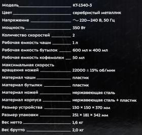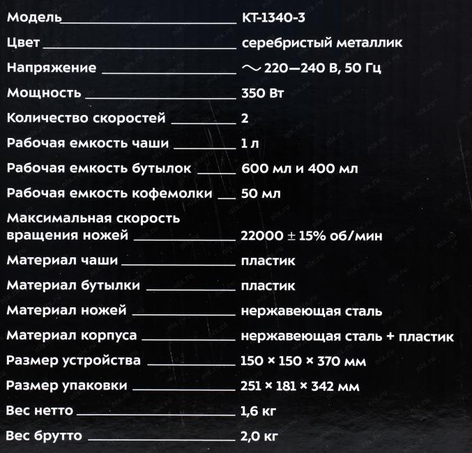 | Особенности | У бутылки имеется флип-крышка, которая предотвращает выливание напитка. 4-лезвийный нож из высококачественной стали отлично смешает различные ингредиенты на 2 скоростных режимах, а также с помощью импульсного режима он измельчит особенно твёрдые продукты. Ёмкость чаши/бутылки 1л/0,6л/0,4л/0,05л |